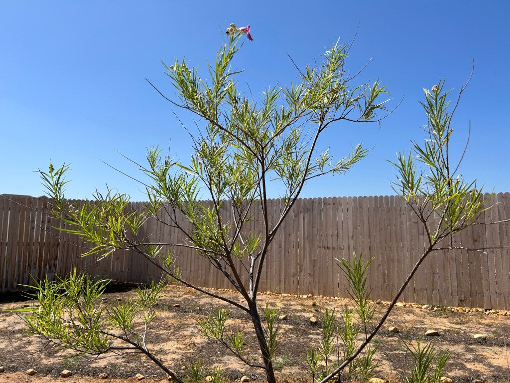 I knew early on that I wanted a Desert Willow tree here. They are very drought-tolerant, thrive in poor quality soil, and the predicted height of 15-40 ft is appropriate to provide (eventually) some filtered shade for this size of lot. They attract birds and butterflies, and they are interesting trees that were unknown to me until I came to Seguin.