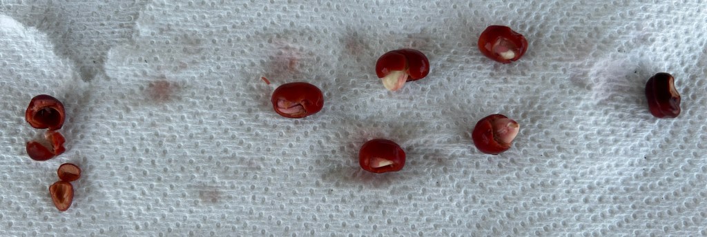 The Texas Mountain Laurel seeds were so hard and slippery that I had to try several approaches before I was successful, also aiming not to damage fingers in the process. What eventually worked was to hold each seed with pliers and then to gently rotate a hand pruner around the edge of the seed until there was a crack. In some cases, a small piece of the casing fell off. Once I saw how thick the seed casing was, it was clear why my initial sandpaper approach was useless. Inside the outer red shell, the seed inside is pale and soft.