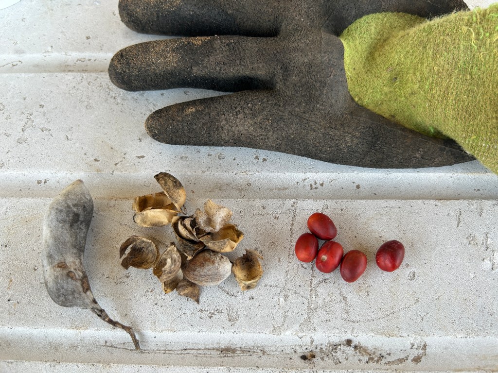 Once the pods drop from the tree, then the outer layer thins and softens as it lays on the ground. It was easy to break open the pods that had fallen to reveal the seeds inside. The photo also shows seeds on the right and pod skins in the middle (glove for scale!).