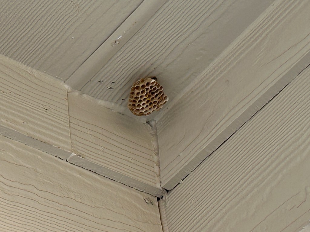 It is possible that this wasp came from the nest that formed on the patio ceiling a few weeks ago. Paper wasps are so called because they take plant fibers and mix them with saliva to make their nests. Unlike the more aggressive hornets and yellowjackets, paper wasps generally only attack if they or their nests are threatened. This nest is probably vacant now, so I’ll remove it when I next have a chance.