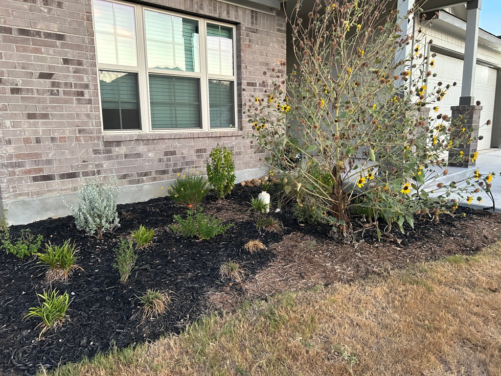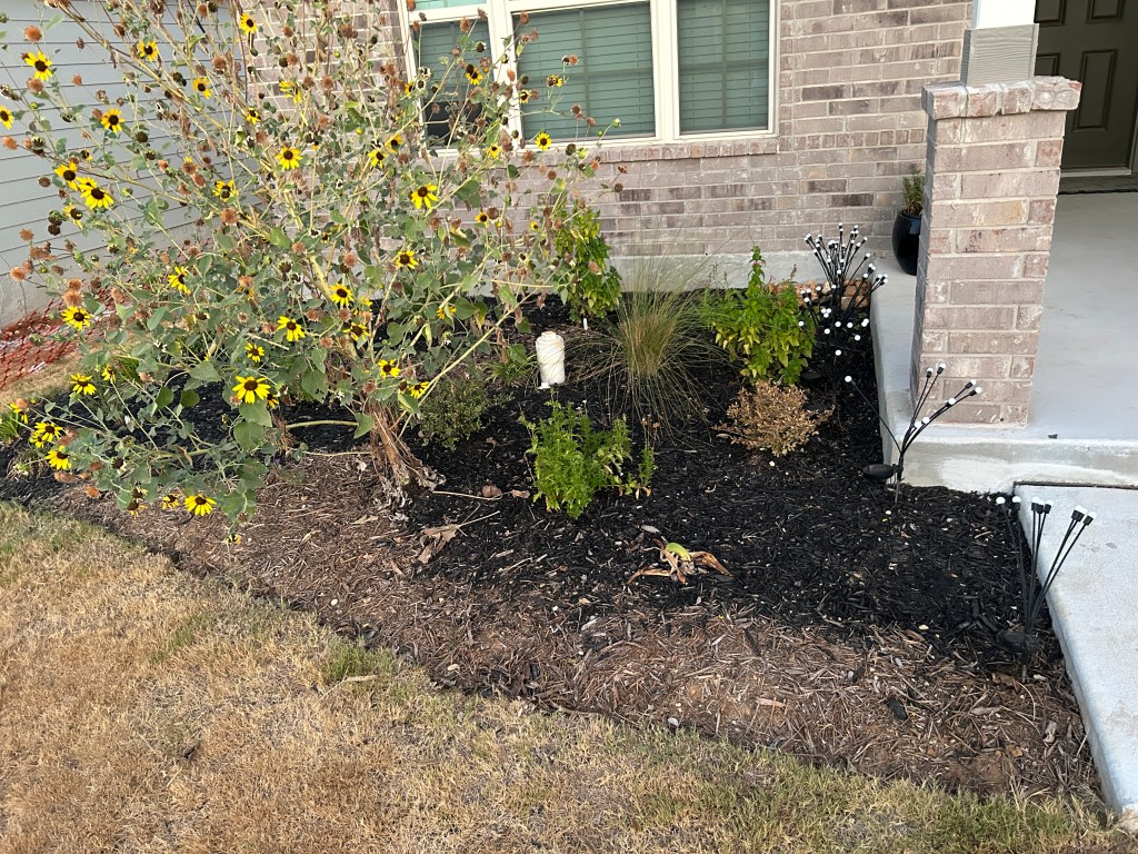 New plants that I placed in the bed this spring include: Scarlet Sage (this is already self-seeding new plants), Texas Lantana, Texas Barometer Bush, Chile Pequin, Gregg’s Mistflower, Skeleton-Leaf Goldeneye, and a couple of souvenir plants from our former house.