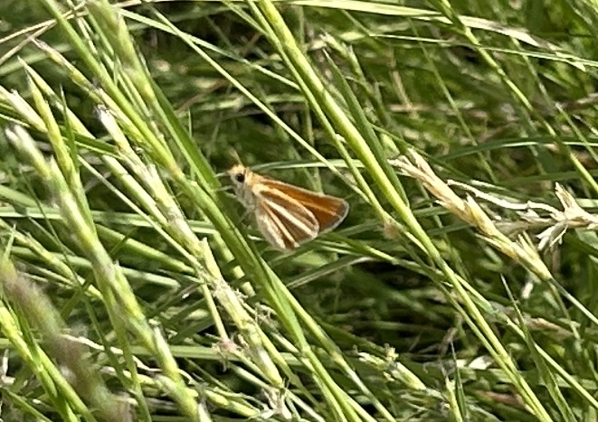 On this day when I went out to see what was happening at 10am, I saw one bee and this tiniest of butterflies. It’s a Southern Skipperling, only about a quarter of an inch long. The first photo here is a crop of the second, to show you how small this is compared to the grass on which it is resting.