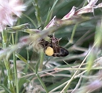 I am not certain, but I think the bees visiting my native grasses might be honey bees of some sort. As these bees visit plants, pollen collects on hairs all over their body, which they then brush into pollen baskets, one on each leg. The pollen is then carried to the nest or hive as food for the colony.