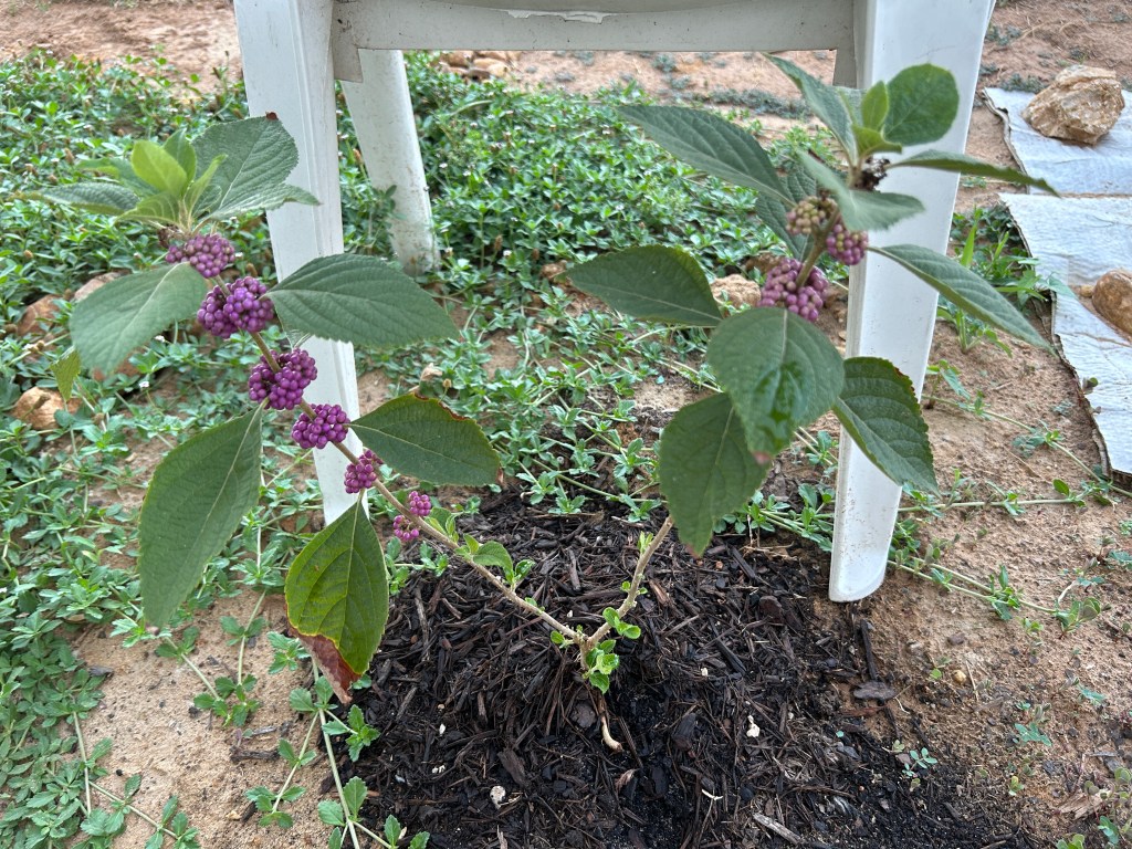 American Beautyberry prefers to grow in part shade. I planted mine in May 2023 in a bed close to the back of the house. This is indeed a part-shade situation, but the sun it does get is hot afternoon sun and being newly planted and then subject to weeks of blistering heat and drought, it was looking a bit droopy.