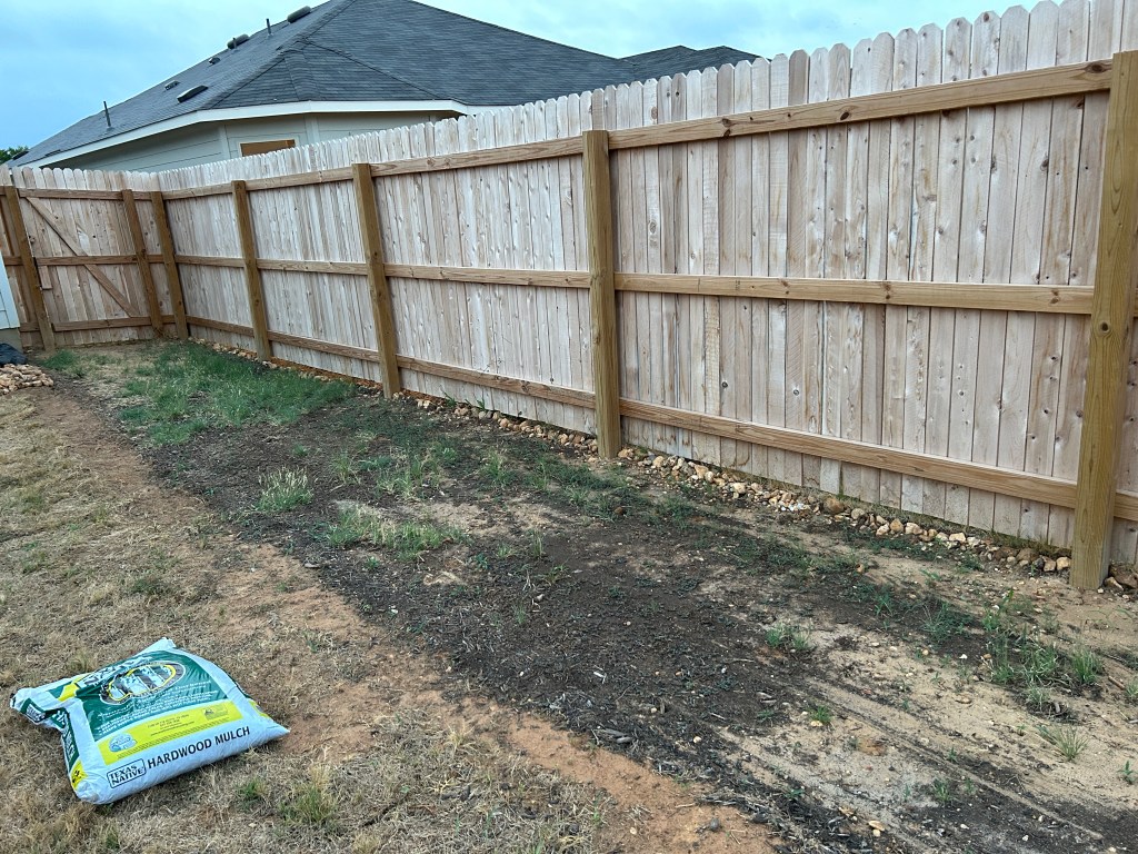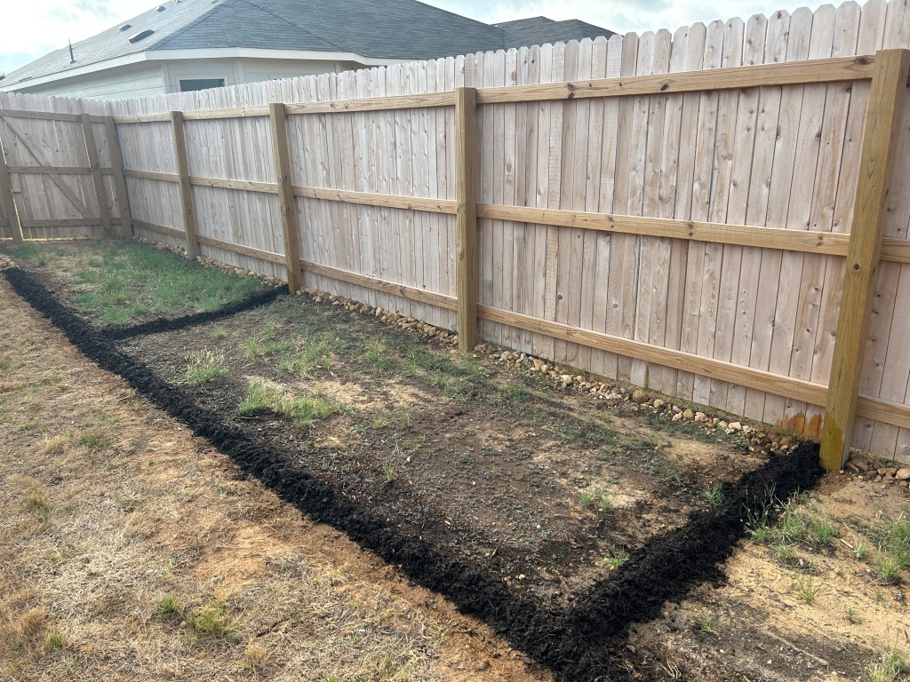 And this is AFTER. The first three fence sections from the gate are the ones where there is no turf in the neighboring lot yet and that’s where I added more height to the stone wall. The region next to fence sections 3 & 4 from the gate is the lowest point and where water pools. The mulch dikes extend behind where this photo is taken as well.