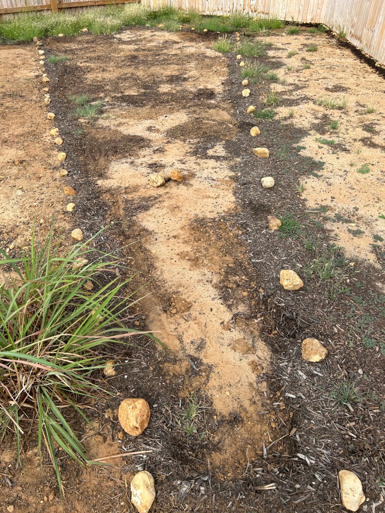 Here’s the starting area, marked with stones. It’s clear of weeds, but where native grasses from the areas behind and right have wandered in, I left those. (The spiky plant on the left is Lemongrass that I brought from Houston.)