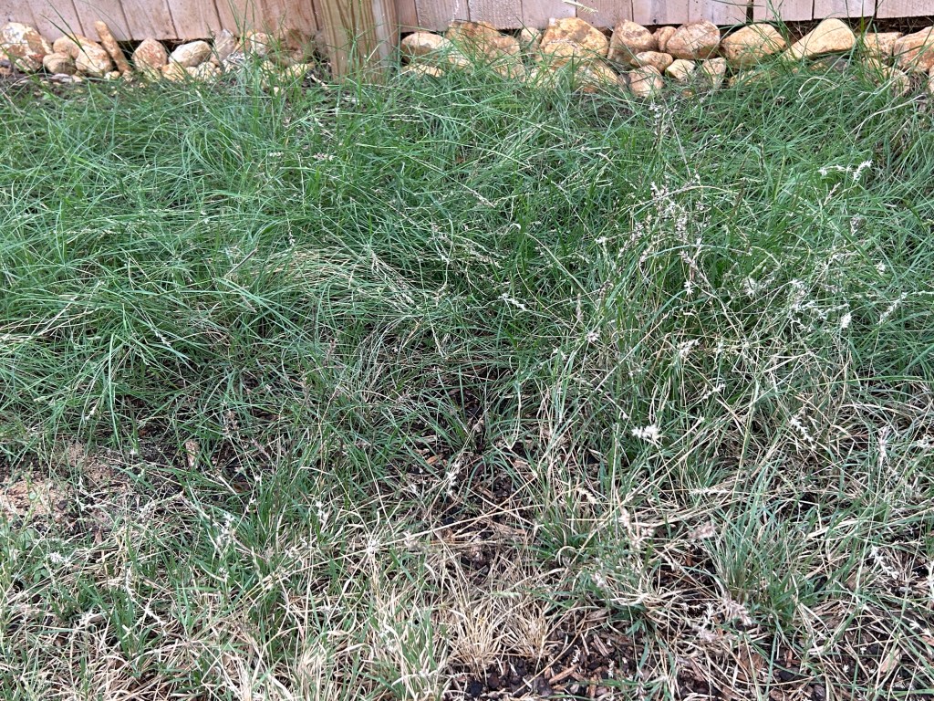 I have defined two areas in my garden for native grasses: a 5-ft strip around the perimeter where a mixture of three short grasses (“Thunder Turf”) have been sown, and a smaller area near the back for three kinds of mid-height prairie grasses.