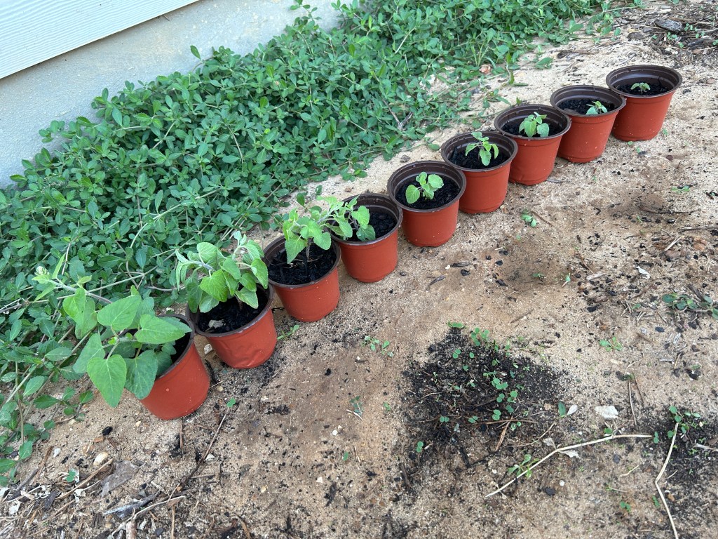 I dug up most of the baby Salvias and potted them, to be used in the back garden or given away after their roots are a little stronger. I lined them up by height because that’s how my brain works.