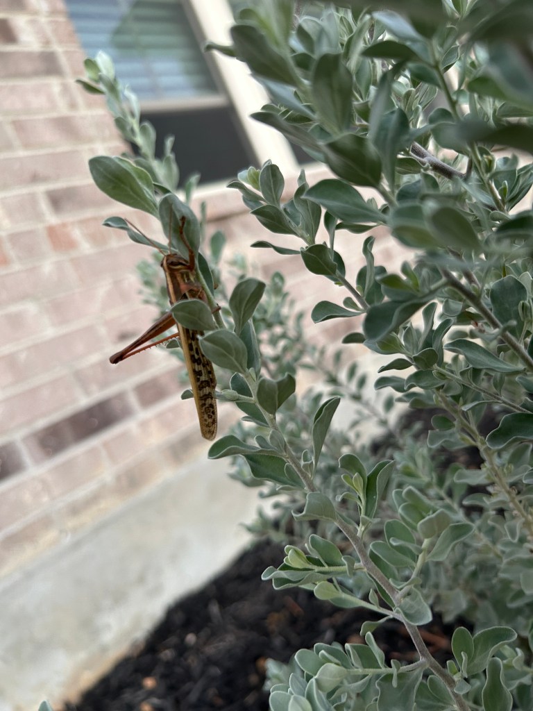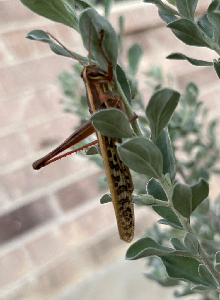 And “chilling” is perhaps appropriate, given that the temperature when these photos were taken was 43F — quite a contrast from 100F just a month ago. These are two American Bird Grasshoppers (Schistocerca americana) resting on a Texas Barometer Bush (Leucophyllum frutescens). I didn’t see any evidence that they had been eating the plant. They are called Bird Grasshoppers because they are strong fliers and can travel long distances.