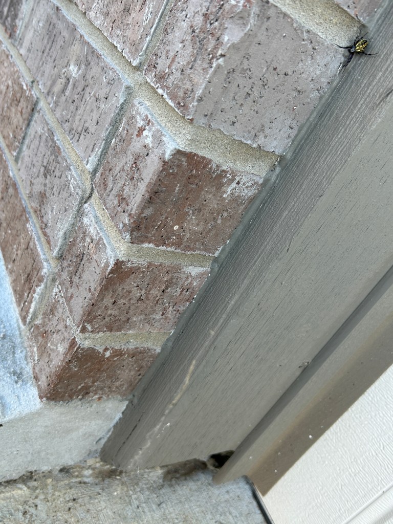 It’s a determined soul. Since I found it, its web has been demolished on a daily basis by heavy rain or strong wind. And yet it remains. Sometimes I’ve seen it on a web (which is hard to photograph), and here it is back on the wall with web remnants hanging down in front of the painted wood.