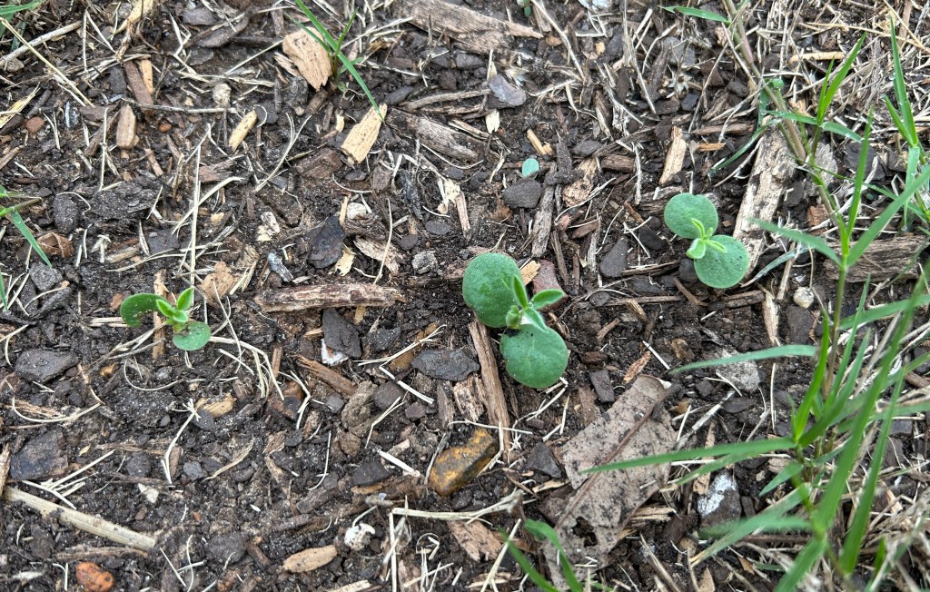 I sowed three kinds of wildflower in the center of the front lawn area a couple of weeks ago, but then the day after that we had torrential rain. I was not confident that the seeds had stayed put, so I repeated the seeding a few days later. The day after that second seeding I spotted several rosettes that looked like germinating Bluebonnet plants so, if true, the timing of that would mean they were actually from the first seeding.