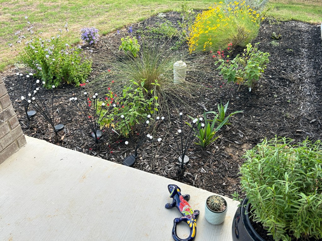 On this day while I ate, I saw several bees mostly visiting the yellow Skeleton-Leaf Goldeneye. An American Bird Grasshopper rested in the grey-leaved Texas Barometer Bush aka Texas Sage. And there was even a Monarch butterfly that briefly visited the purple plants (Gregg’s Mistflower, Fall Aster, Black & Blue Sage). This is definitely one of my happy places.