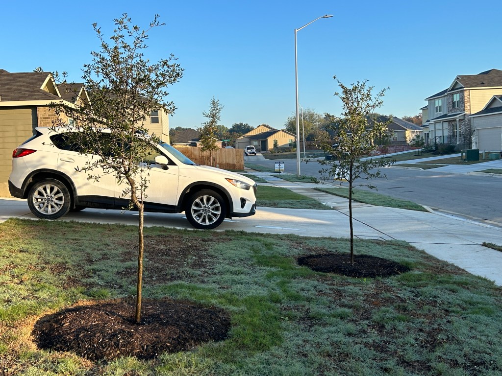 We have two Live Oak trees in front of our house planted by the builder. I pondered for a long time whether to keep or replace them (if they grow to maturity, they — or their roots — will be too big for that space), but for now they are staying. I (or the future house owners) may eventually regret that choice, but I just hated the thought of removing two healthy, native trees.