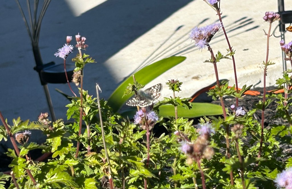 On this particular lunch-time visit to my pollinator garden, there were at least three butterflies that I could see on the Gregg’s Mistflower. I believe the two orange ones are Fiery Skippers (Hylephila phyleus), and the black & white one is a Checkered-Skipper (Genus Burnsius) of some sort.