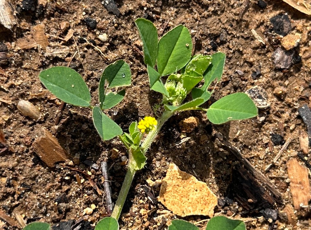 Black Medick (Medicago lupulina) is an invasive weed, although it can improve soil quality because of its nitrogen fixing properties, and most livestock will eat it. Plants of the genus Medicago are otherwise known as burclovers because they are related to other clovers and their seeds are highly barbed. Surely everyone at some point has collected these annoying prickly seeds on their socks or dogs.