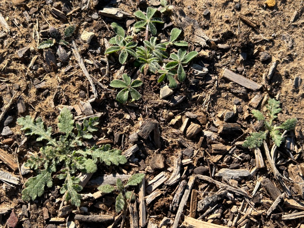 Wildflower seeds that I planted last year, such as Bluebonnets (Lupinus texensis) at the top of the next photo, normally grow “rosettes” in the fall where leaves lie flat to the ground and roots are growing strong. Then in the spring, the plants grow taller and produce blooms. They don’t mind cold winters. These guys are just waiting for warmer weather to proceed further.