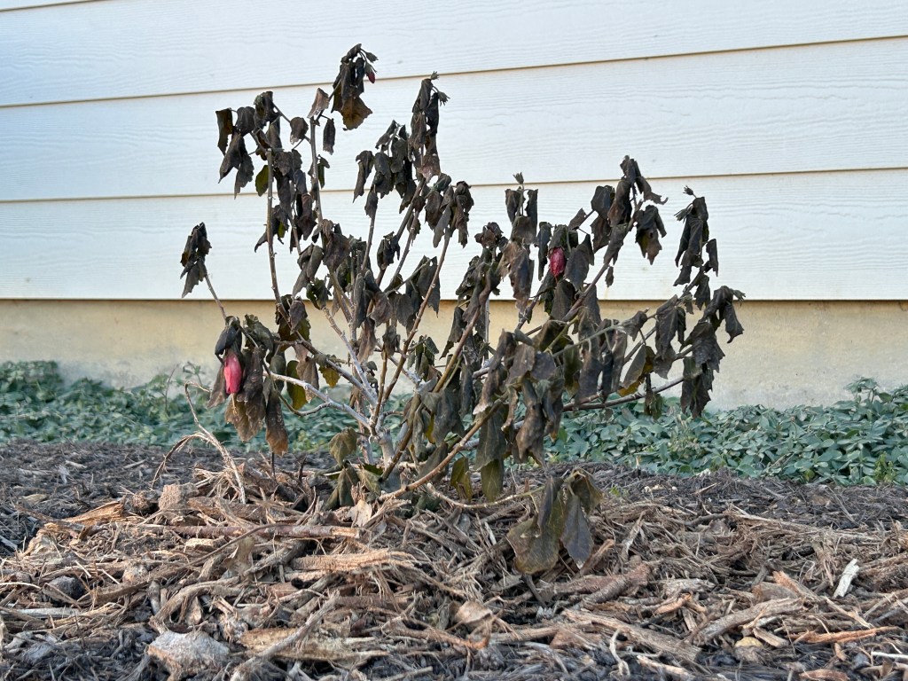 I expected to see some wilting, blackness, or loss of leaves and we certainly had that. With native plants, that is almost never a concern, and it’s just a part of nature cleaning up. Where possible, I will avoid trimming anything until we have passed entirely through our frost season — newly trimmed plants could be more vulnerable to future frosts if we have them. So it’s perfectly normal for parts of a native garden to spend some time over the winter period looking black and straggly. This is my Turk’s Cap, looking exactly the way I expected it to.