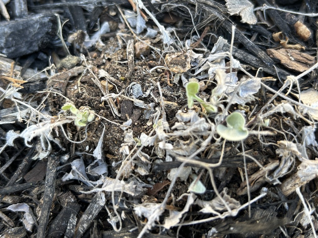 In late October last year, I planted three small specimens of Silver Ponyfoot (Dichondra argentea) in the front pollinator garden. This is a sun-loving native groundcover with white flowers and grey/green-colored leaves that have a metallic appearance in sunlight. During the winter it froze back but did not die. All three plants are showing new growth from the roots. Hopefully with more time to establish this year, they will cover more ground and become more resilient.
