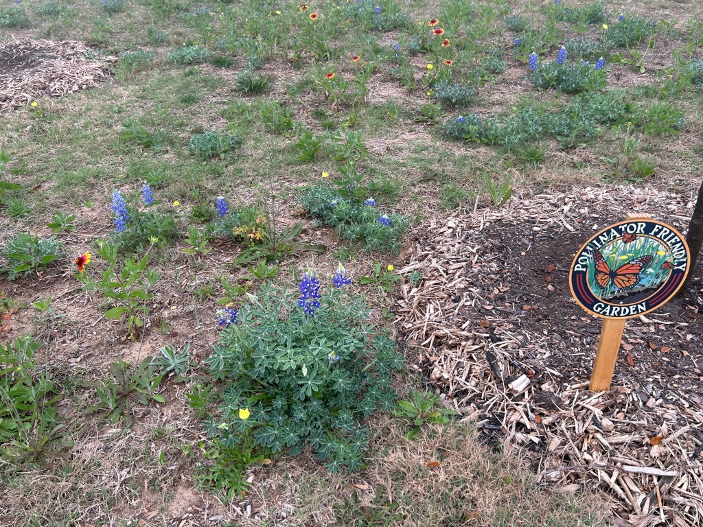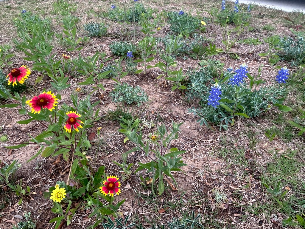 Last fall I spread three kinds of wildflower seeds in the center part of the front lawn: Texas Bluebonnet (Lupinus texensis), Indian Blanket aka Firewheel (Gaillardia pulchella), and Spotted Beebalm (Monarda punctata). In addition, apart from thistles and burclovers (which I pull out and discard), I am allowing volunteer plants to stay, and I’m only trimming around the edges of the area.
