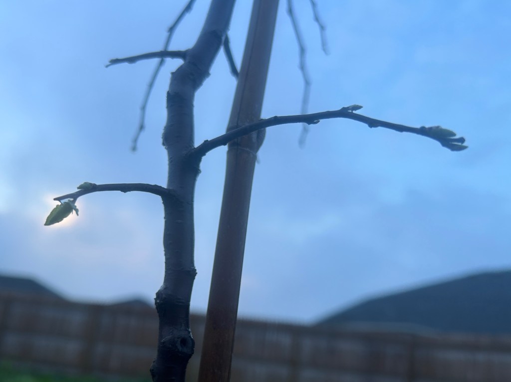 Sure enough, on March 13, 2024, I finally saw some tiny leaf buds on the lowest branches. This is a deciduous tree that I bought in the fall after its leaves had dropped, so this is my first time to see leaves on it. Hopefully after another year to grow stronger, next spring I will get blooms as well.