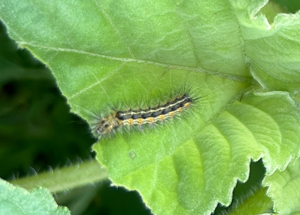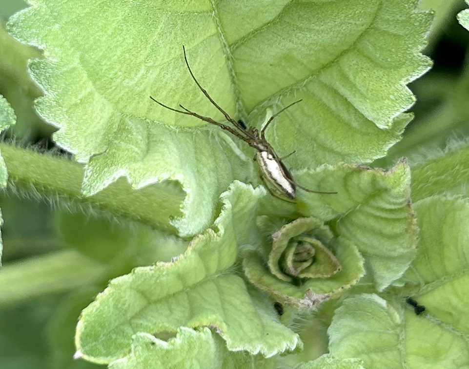 As I was passing through the garden I noticed this assemblage of visitors (photo above) on a volunteer sunflower (not yet blooming). I didn’t have time to properly identify them, but in that one field of view there were at least two lady beetles, one spider, and one caterpillar. Here are some crops of the same photo to show more detail.
