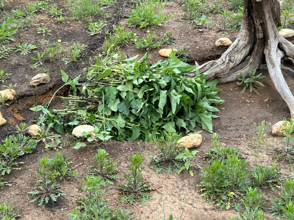 Sunflowers seem to attract a plentiful and diverse collection of insect visitors, so rather then compost the cuttings immediately, I’m leaving them on the ground for a couple of days to allow visitors to escape to another location. Then the pieces will go in the compost. The first photo in this post is the cuttings piled up in the swale since that was a handy bare patch of soil.