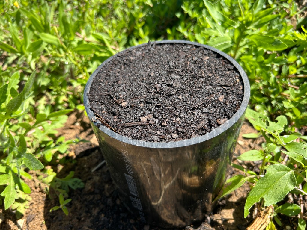 Each tube had its original soil in the bottom, then planting soil, then compost. It got a good watering and then pushed down and topped up with compost. Then I left it for a day to settle, topped it up to the rim with compost, and then added one fresh Swiss Chard seed, pushed 1/2-inch down.