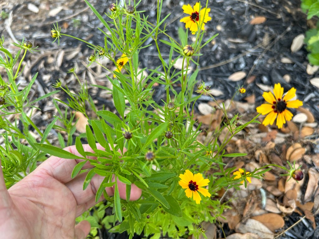 This plant has volunteered in several parts of the front pollinator garden. I’m certain this is a Tickseed, but I don’t know which one. It’s related to the Lanceleaf Coreopsis (Coreopsis lanceolata) that I planted underneath my rain gauge.