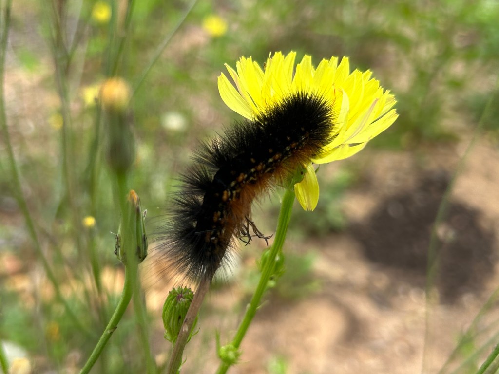 I believe that this is a Salt Marsh Moth caterpillar on a Common Sunflower (Helianthus annuus) leaf. The older instars (larval forms) have long black hairs.