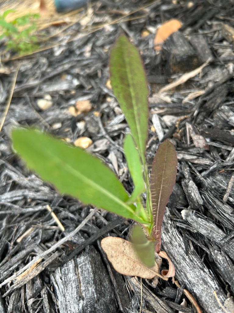 The plants that I have here are only a few inches tall, but supposedly they can grow up to 6 feet. There are fine spines along leaf edges and veins on the underside (see photo above), which is primarily how I am identifying them at this young stage. The stems and leaves emit a latex when cut.