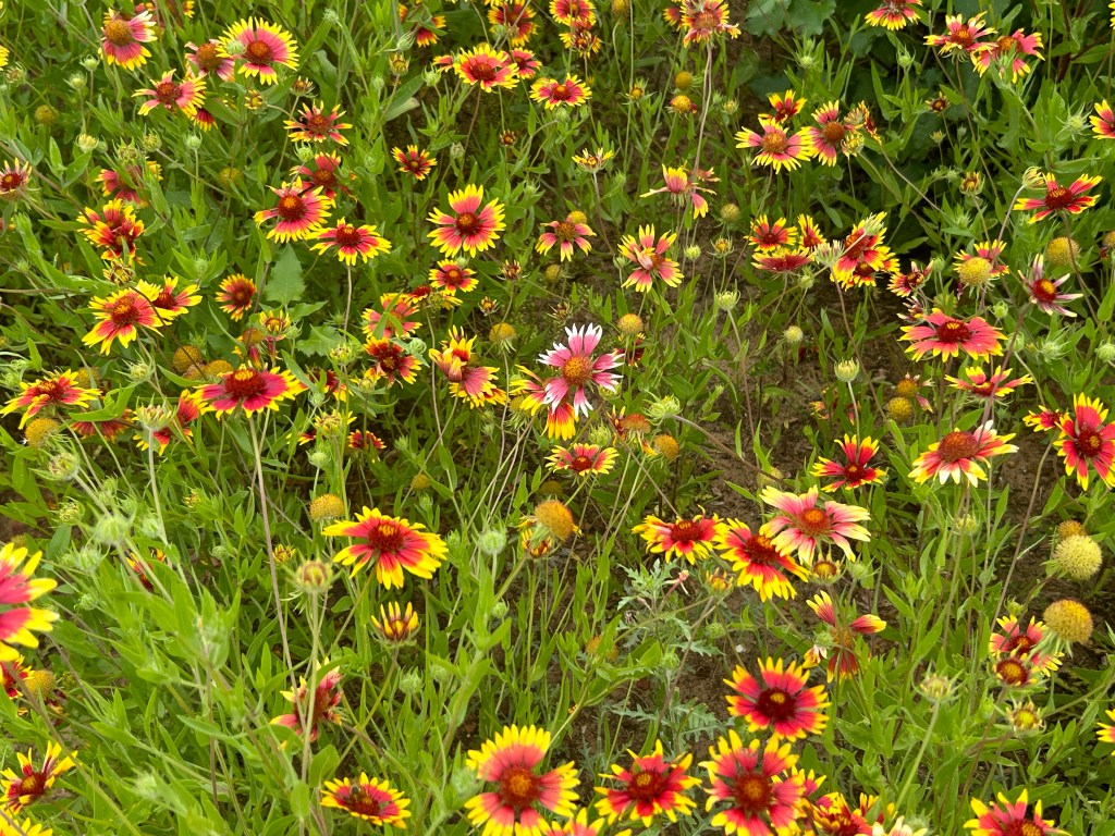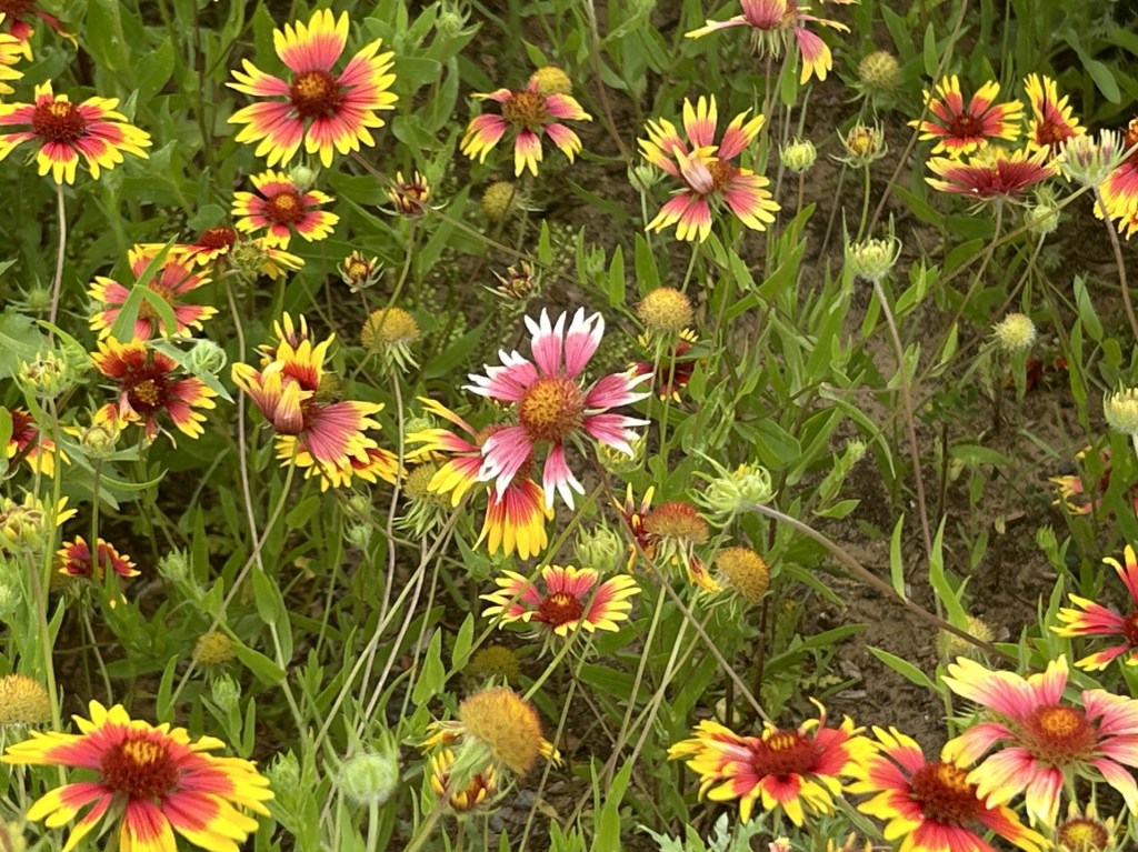 I have so many Firewheel aka Indian Blanket (Gaillardia pulchella) here that it doesn’t surprise me to find some mutations here and there. As an example, the pale flower in the center of the above photo was the only one on its plant with that coloration, which looks as if it’s missing some yellow pigment.
