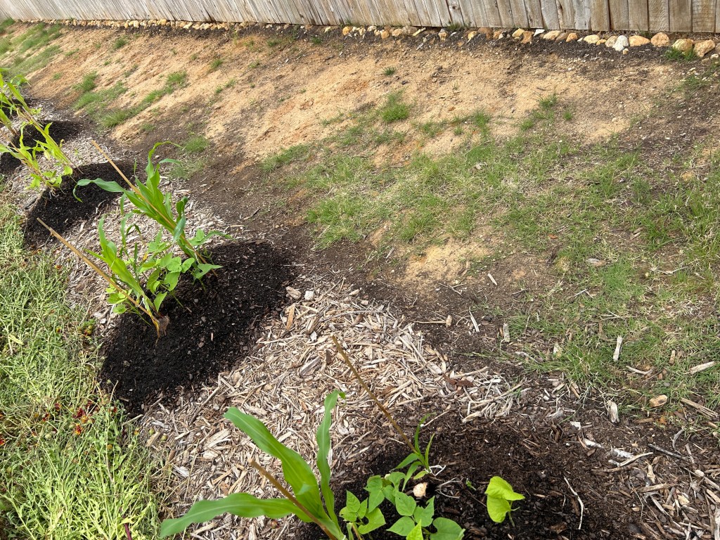 - The left edge is most prone to flooding because of the grade of this lot (although less so now I have the swale) and gets the most shade from the nearby south-facing fence. There is moderate grass growth there (10% coverage?). I will reseed the grasses here as well, although I am also going to add Frogfruit on that side in case the shade is too much for the grasses.