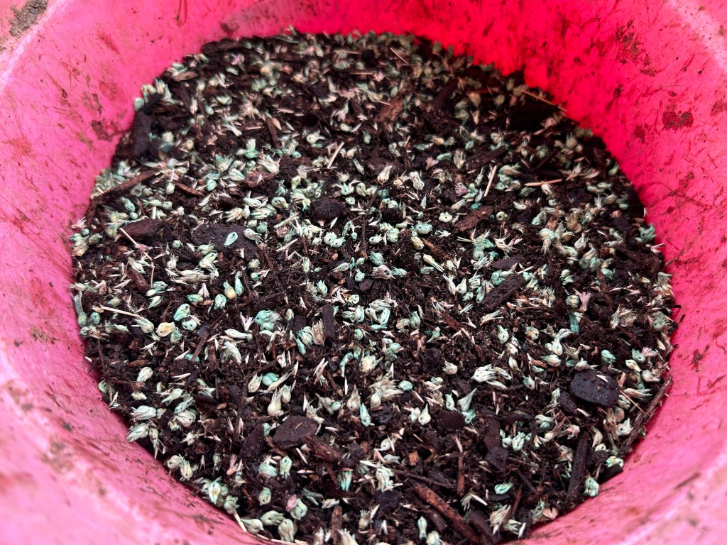 Then I scattered several bags of soil and compost over the bare patches. I mixed the seed with more soil in a bucket to make it easier to disperse, and scattered it over the bare patches.