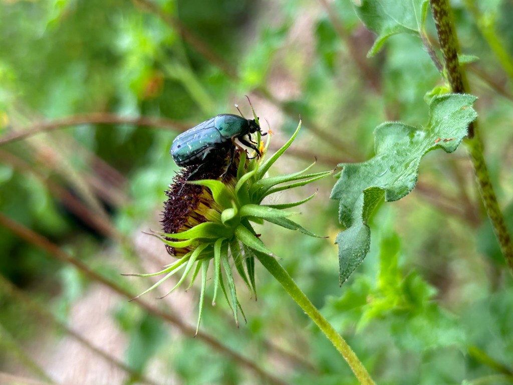 This shiny dark green beetle on an old sunflower head caught my eye as I was passing. It’s a Dark Flower Scarab (Euphoria sepulcralis). They are not known to eat seeds, but perhaps it was after pollen or nectar. Such a beautiful creature!