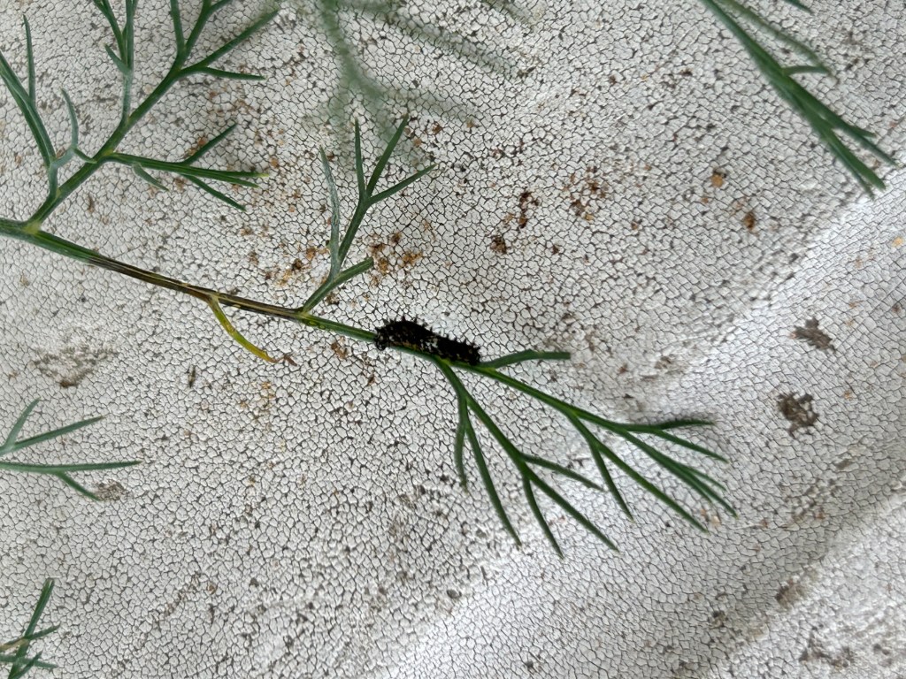 A few days later I wasn’t paying attention when I cut a few sprigs of dill for a recipe, but before I took them indoors I noticed a tiny caterpillar passenger.