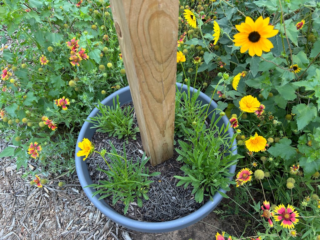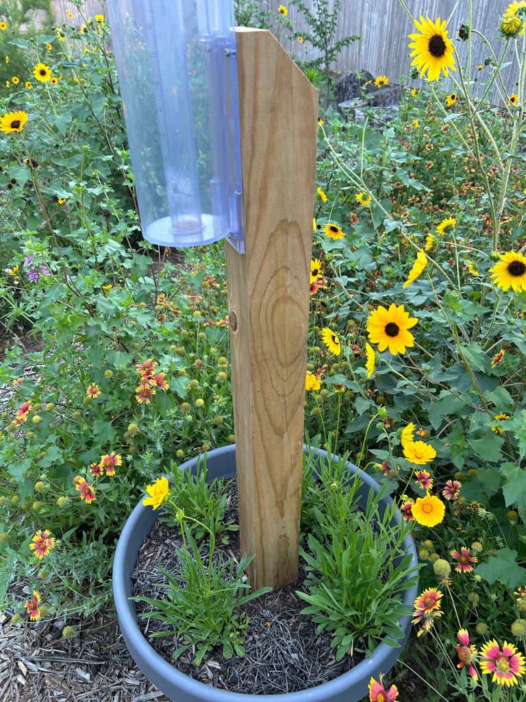 Undeterred, that was my choice of plant to put in the giant pot that supports my rain gauge. It is now flowering, although it’s a little hard to notice among the other yellow blooms in the garden. I’m glad this one seems happy.