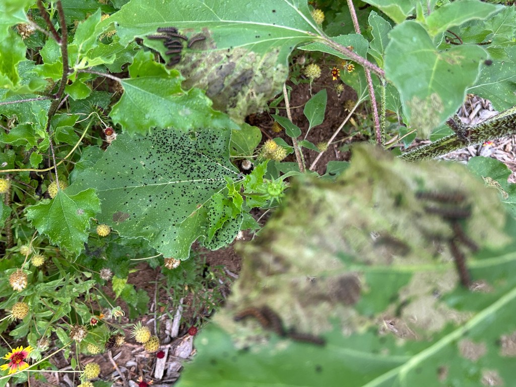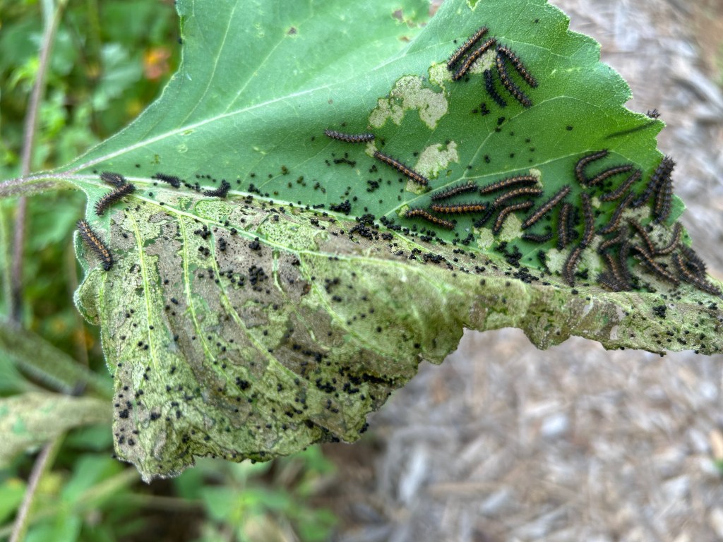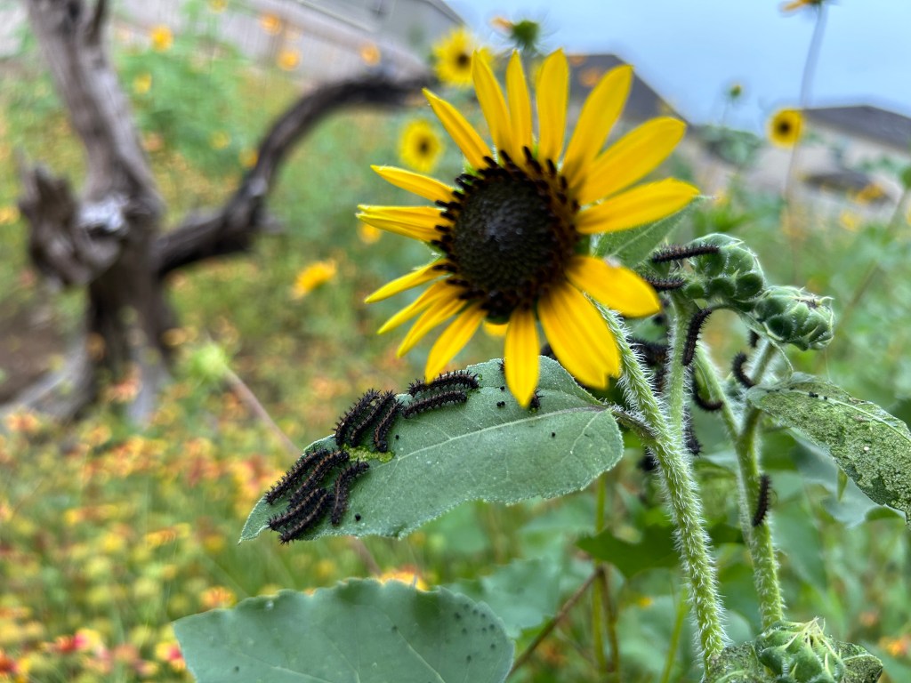 One of the host plants for Bordered Patch butterflies, which I have seen here, is sunflowers and I do have an abundance of those. I wrote last year about observing Bordered Patch caterpillars, and I am starting to see them again.