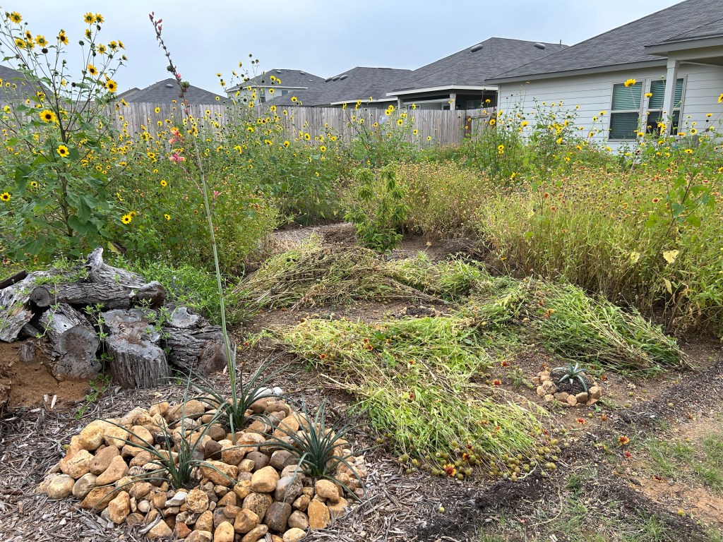 Currently, most of the annual plants in the back yard are Firewheel aka Indian Blanket (Gaillardia pulchella), Beach Sunflower (Helianthus debilis), and Common Sunflower (Helianthus annuus). Curiously, the Firewheels in the front meadow are shorter (1-2 ft) and bloomed earlier than the ones in the back yard, which are about a foot taller and bloomed later. I bought seeds for both locations from the same source.
