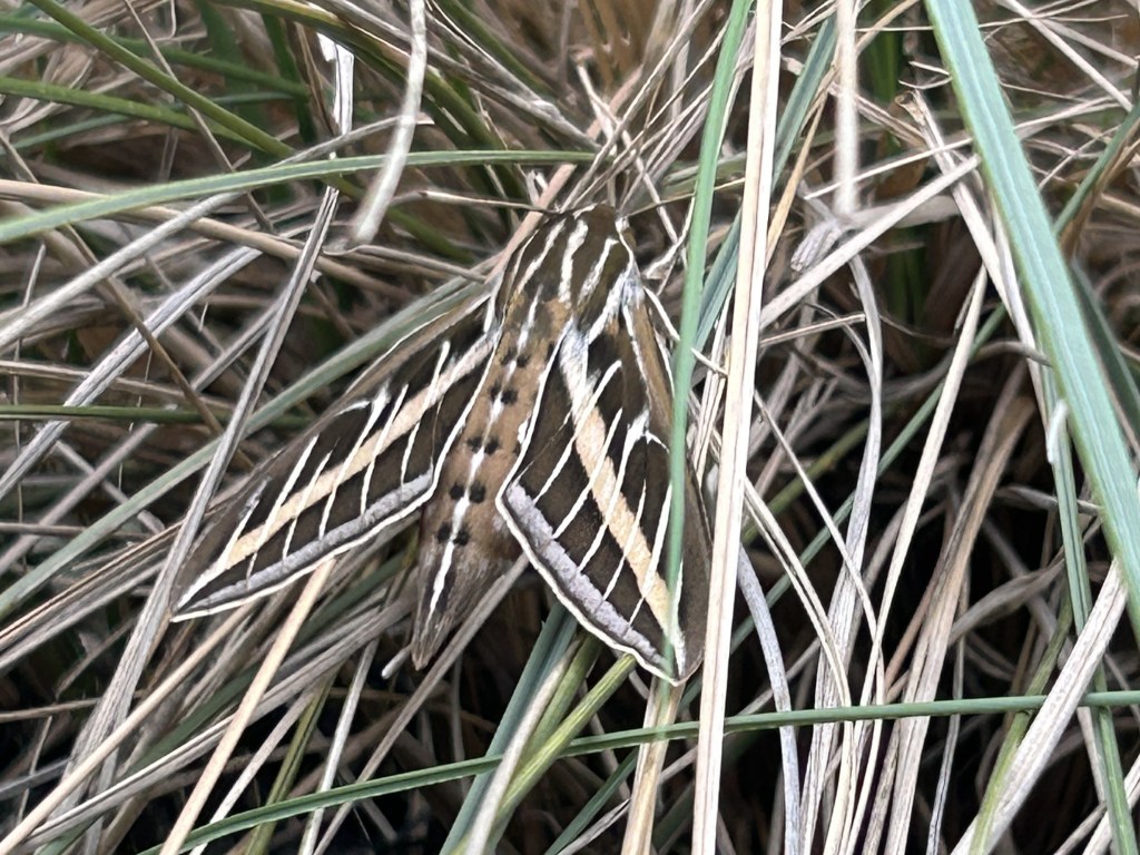 I was able to sneak up for a photo of this well camouflaged creature, and it turned out to be a moth: a White-Lined Sphinx (Hyles lineata). Another name for this is Hummingbird Moth because of its large size (wingspan 2-3 inches) and flight pattern. It certainly did fool me at first.