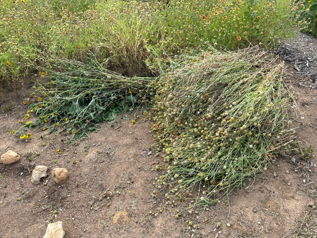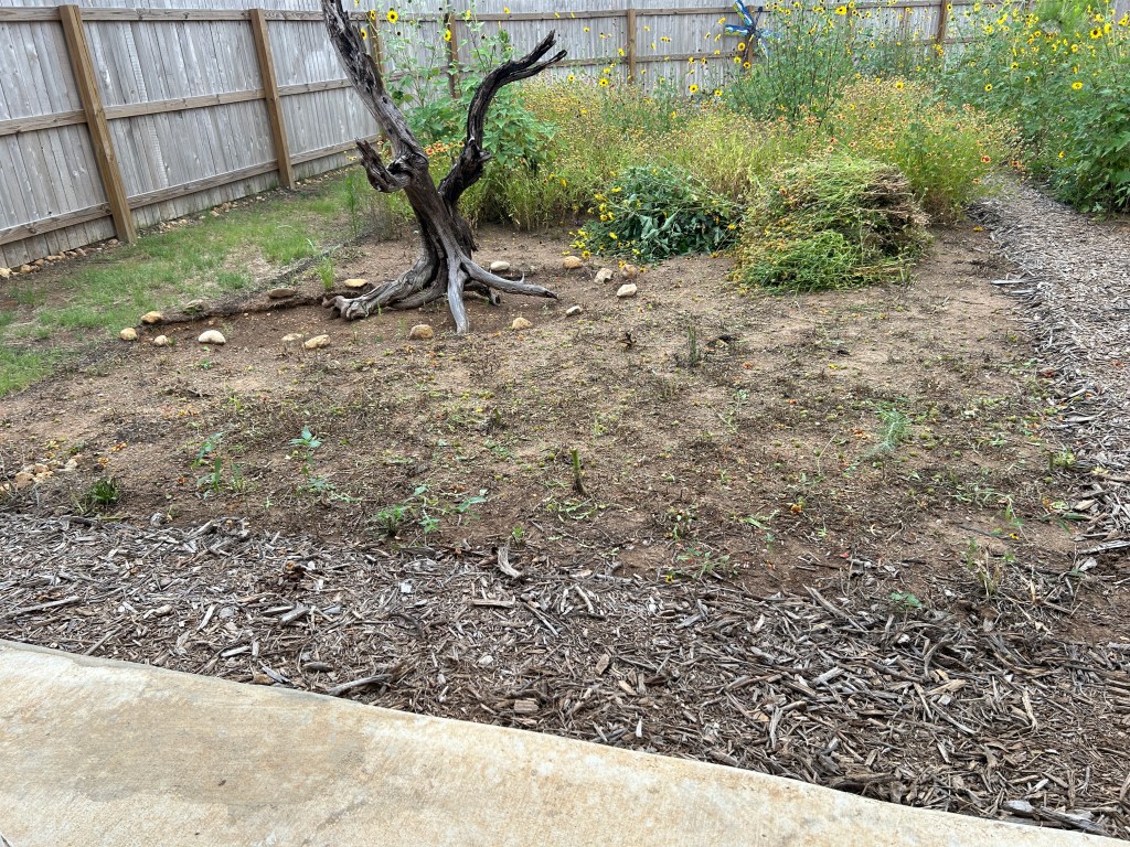 The first of many steps is to clear the area of annual plants. Given the size of my lot, the pond itself will have to be quite small, but I need a greater area than that cleared to give room for the work, and also to run an electrical line from the patio to the pond area. In addition, the Firewheel and Sunflower plants that were growing in that quadrant of the garden were so tall that they would block view of the pond from the house and patio. Once the pond is installed, then I will plan for shorter native plants to go in front of it.