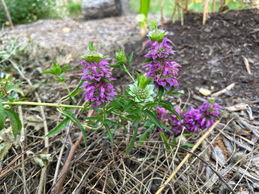 I like Lemon Beebalm aka Purple Horsemint (Monarda citriodora) and there is one pretty volunteer that kept falling over in the garden. Before I could get around to staking it, it had become quite comfortable just laying across a path and the flowers had adjusted to growing upwards, even though that was technically sideways. So in the end I just left it and I step over it if I’m going that way.