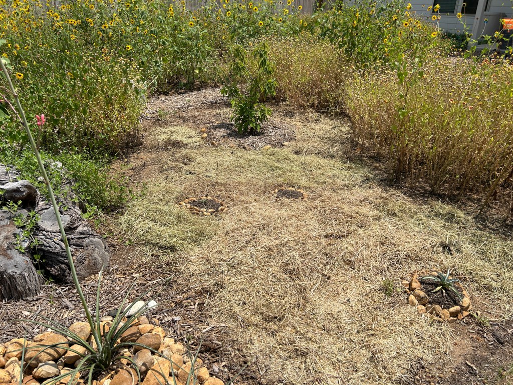 The final product resembles a mixture of straw from the plant stems, and a powder from the dried leaves. In the area that I had recently cleared near my baby Agave plants, the shredded material does a much better job of covering the ground than the whole stems, and I hope that it will break down more quickly to feed the soil. The photos below are first with cut stems (on the day they were cut), and then with shredded stems a week later.