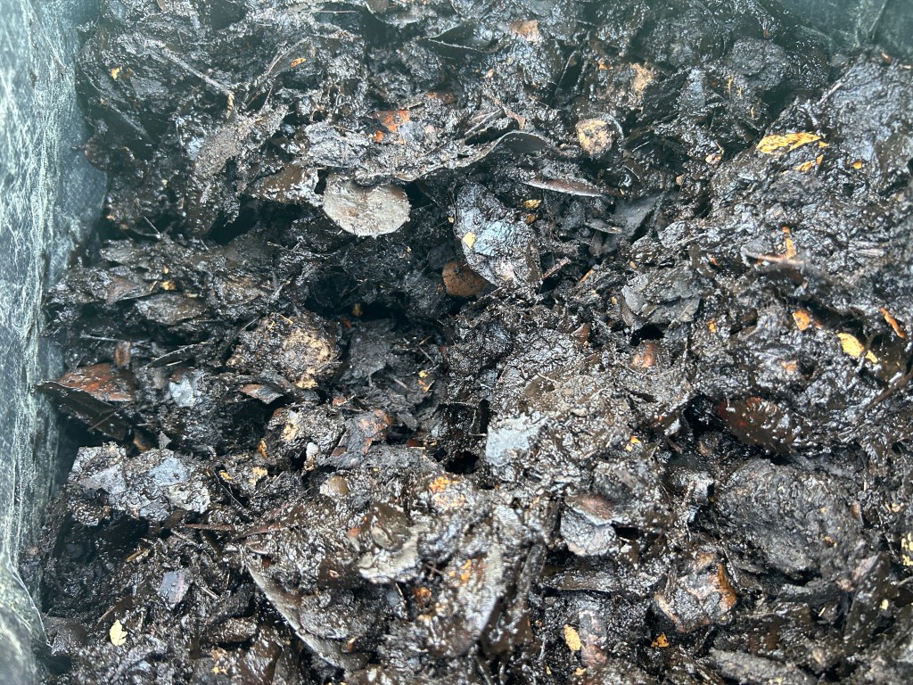 After I emptied out the chamber, the yield was a small bag of a wet substance that I would liken to a mixture of compost and mulch. (It wouldn’t normally be quite so wet, but we had had rain the night before.) This is not the consistency of compost that one can buy, but I believe it to be nutritious for the garden all the same. My system isn’t big enough, nor do I have the processing time, to properly break down things like oak leaves and small twigs. I don’t need my compost to be pretty, so I don’t bother to sieve it.