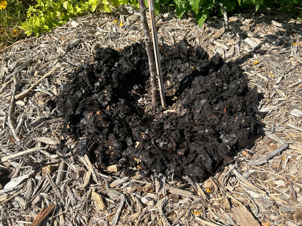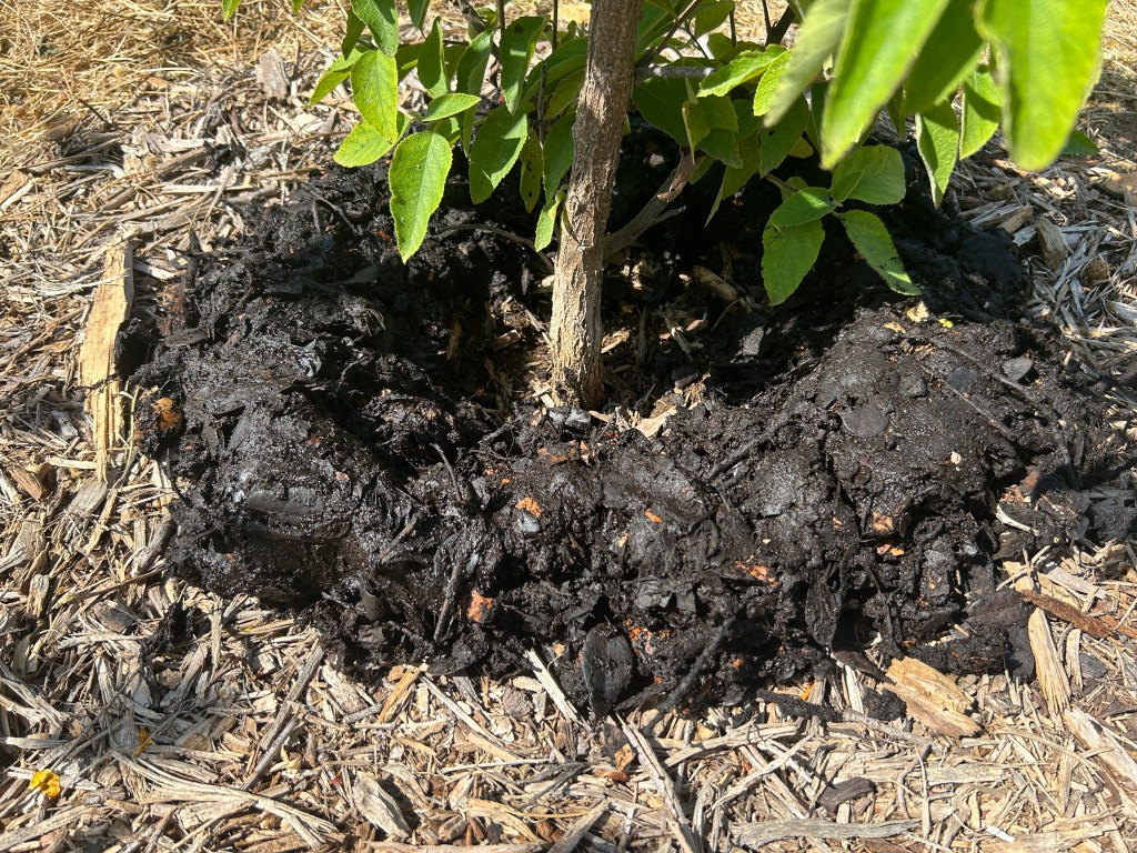 I chose to give this batch to my three youngest trees in the back yard (Mexican Olive, Mexican Plum, Red Buckeye), so I placed the compost in the center of their mulch rings — although importantly not right up against their trunks. As it dries out and continues to break down, I may spread it out a little thinner.