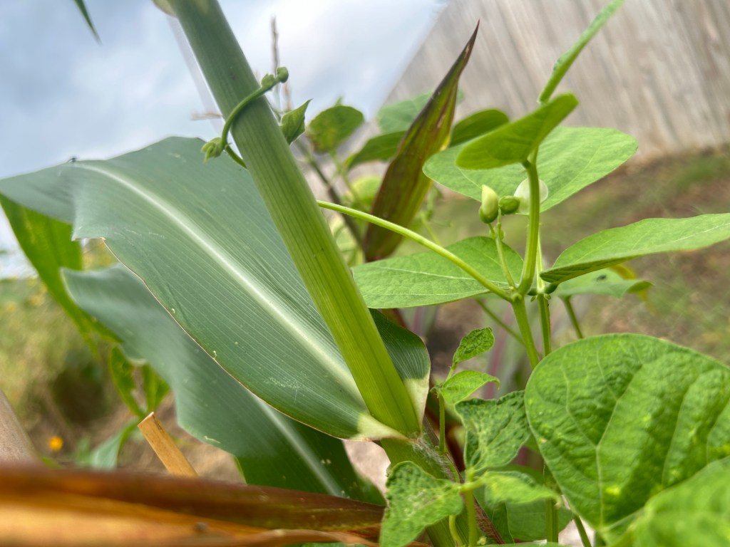 Most of the bean plants have grown long enough to climb up something nearby — either a corn plant or a stake that was placed to support a corn plant. There are a few flowers here and there.