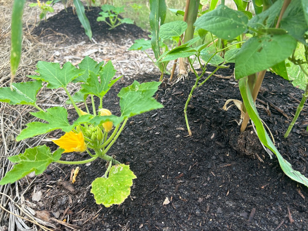Some of the squash plants have begun to flower. The plants themselves are small and not doing much to shade the soil (their supposed role in the “three sisters” cooperation), so I’ve left them at four plants per mound for now (the original plan was to cull to two plants per mound).