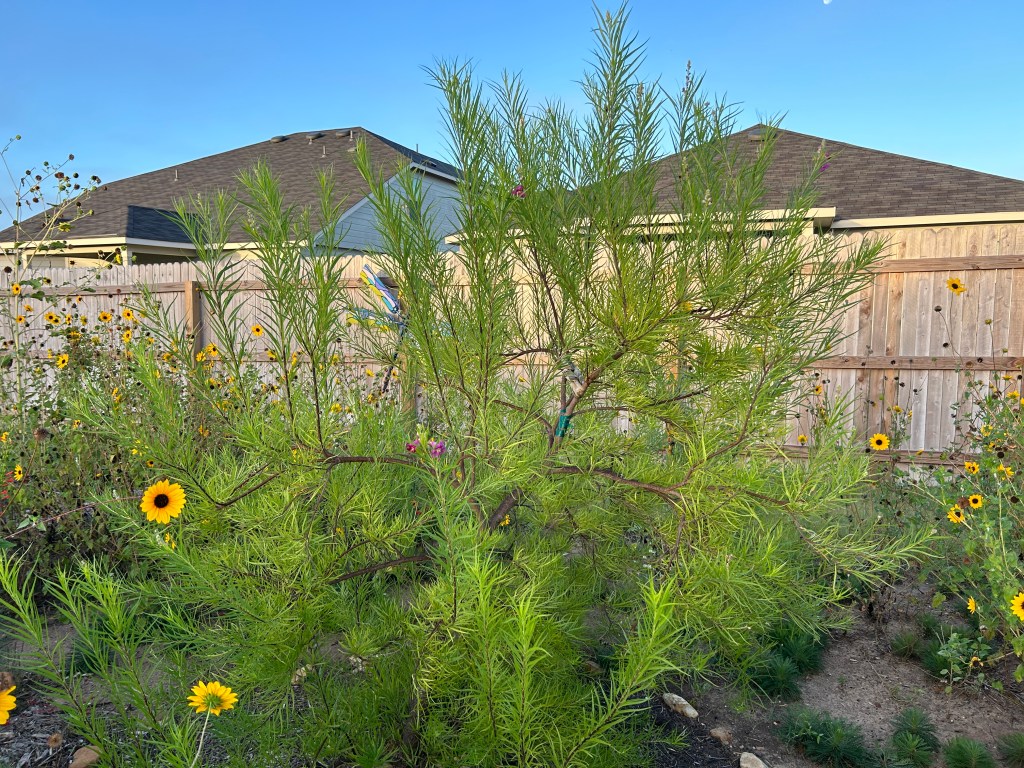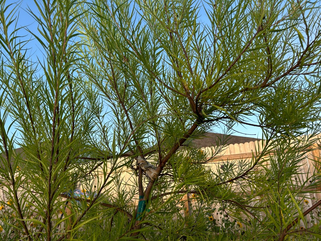 The Desert Willow (Chilopsis linearis) was one of the first trees planted here, and eventually will be the tallest in the back yard. (It is the tallest tree, but not the tallest plant, yet.)