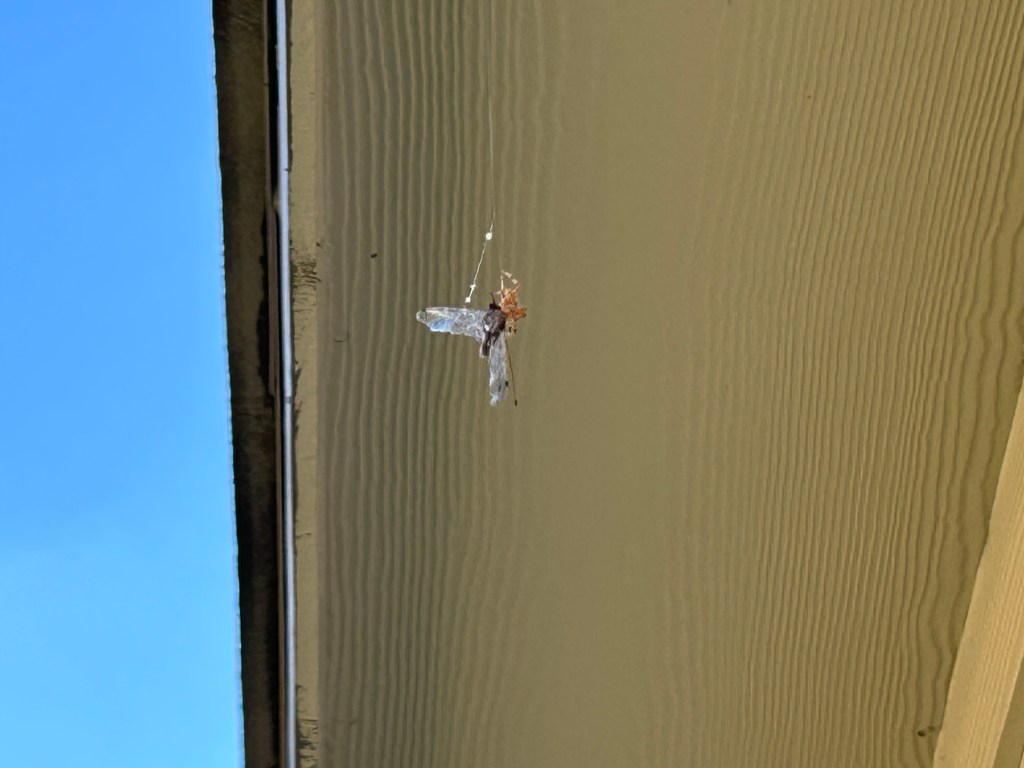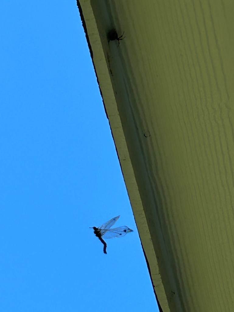 At that point, presumably feeding was happening. When I looked again an hour or so later the spider was back up in the eaves with the dragonfly carcass left to dangle in the breeze.