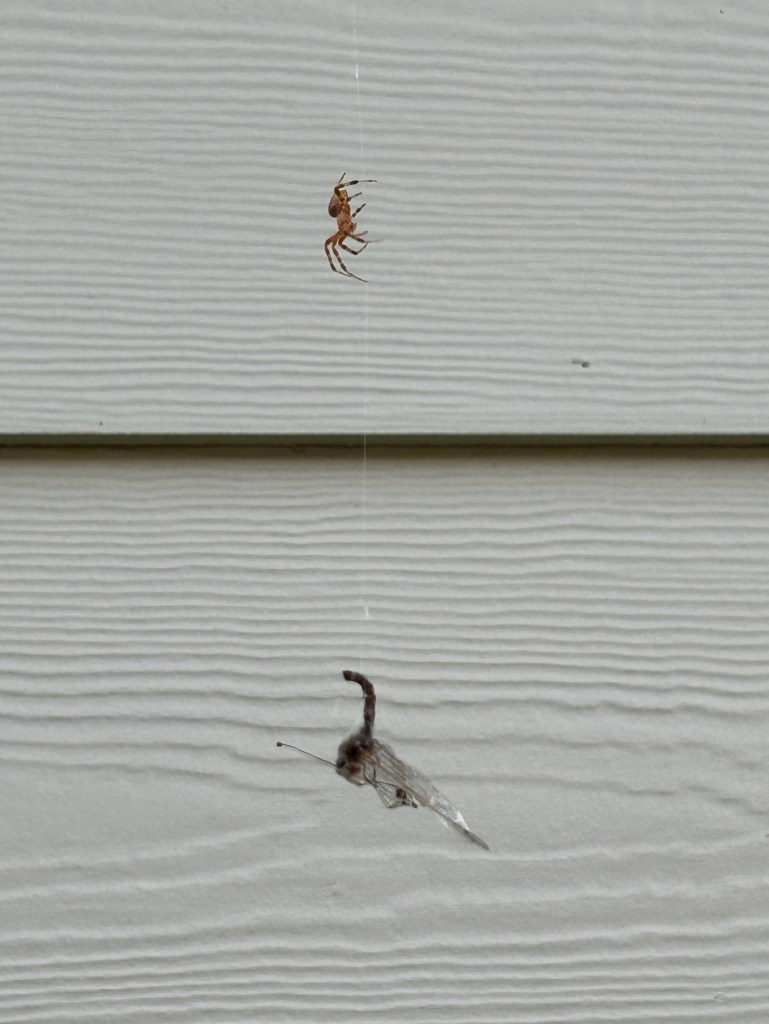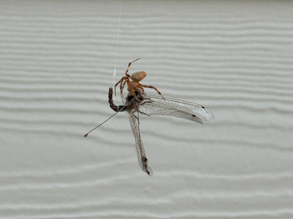 Two things were surprising about this encounter. One was that this spider, known for making webs, was only working on a single thread. The other is that Spotted Orbweavers are usually nocturnal. However, I suppose that if breakfast accidentally delivers itself, you don’t waste the opportunity.