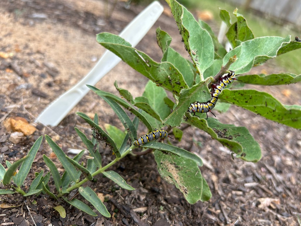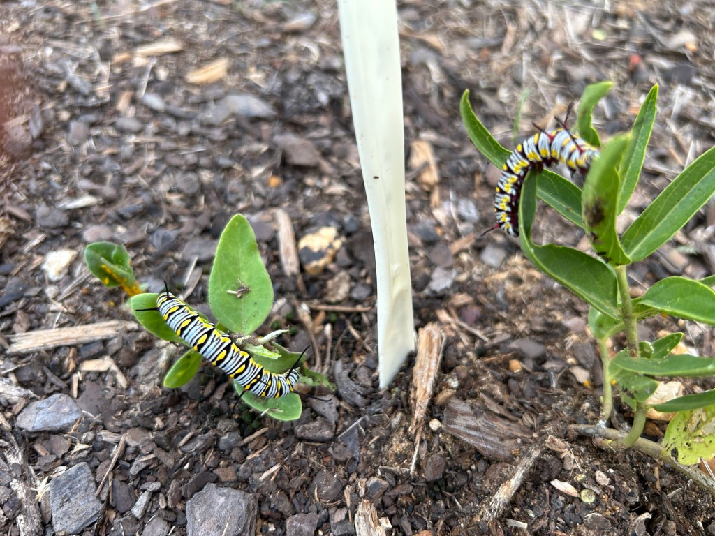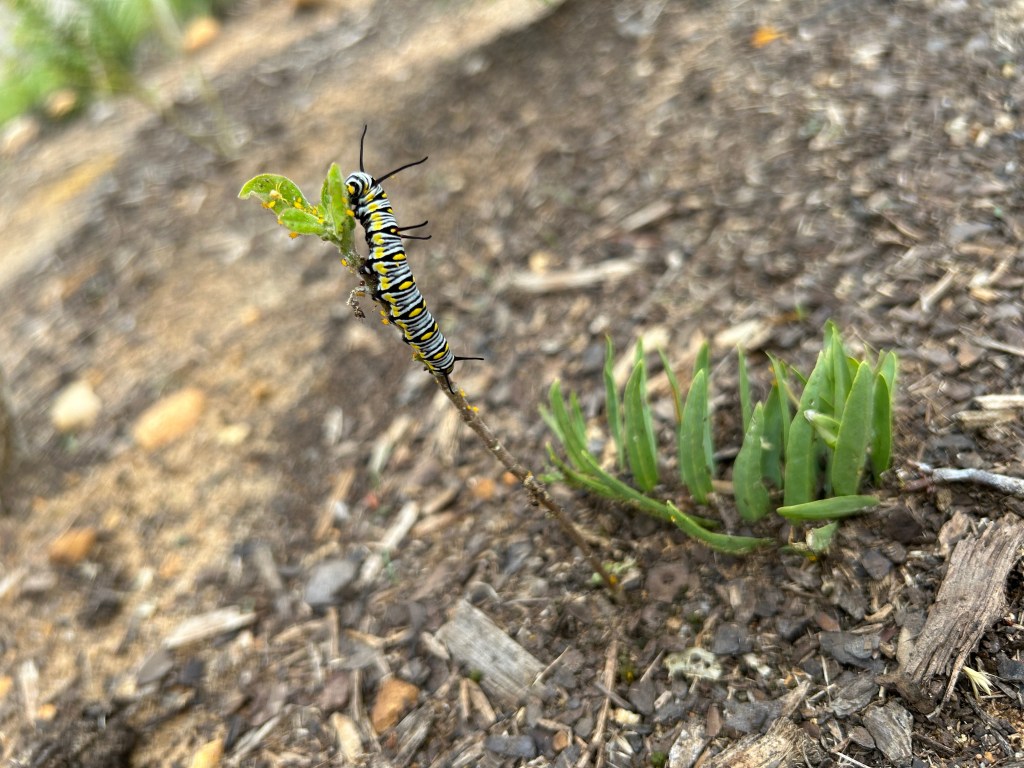 After a few days of this caterpillar/plant management, one caterpillar disappeared and did not return. The next day I saw none. Of course it is possible that some predator bird visited for a snack, but I’d like to think that it was time for them to pupate. Caterpillars will usually move away from their host plants to do that. I’ve looked, but have been unable to see any nearby chrysalises.